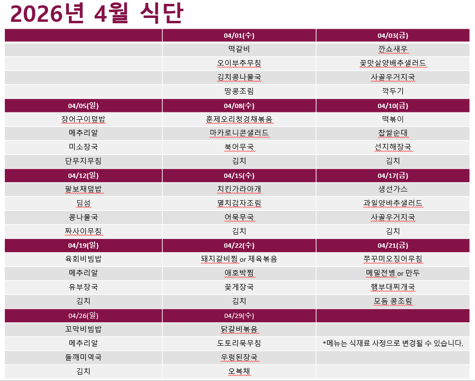 명동밥집 2026년 04월 식단표