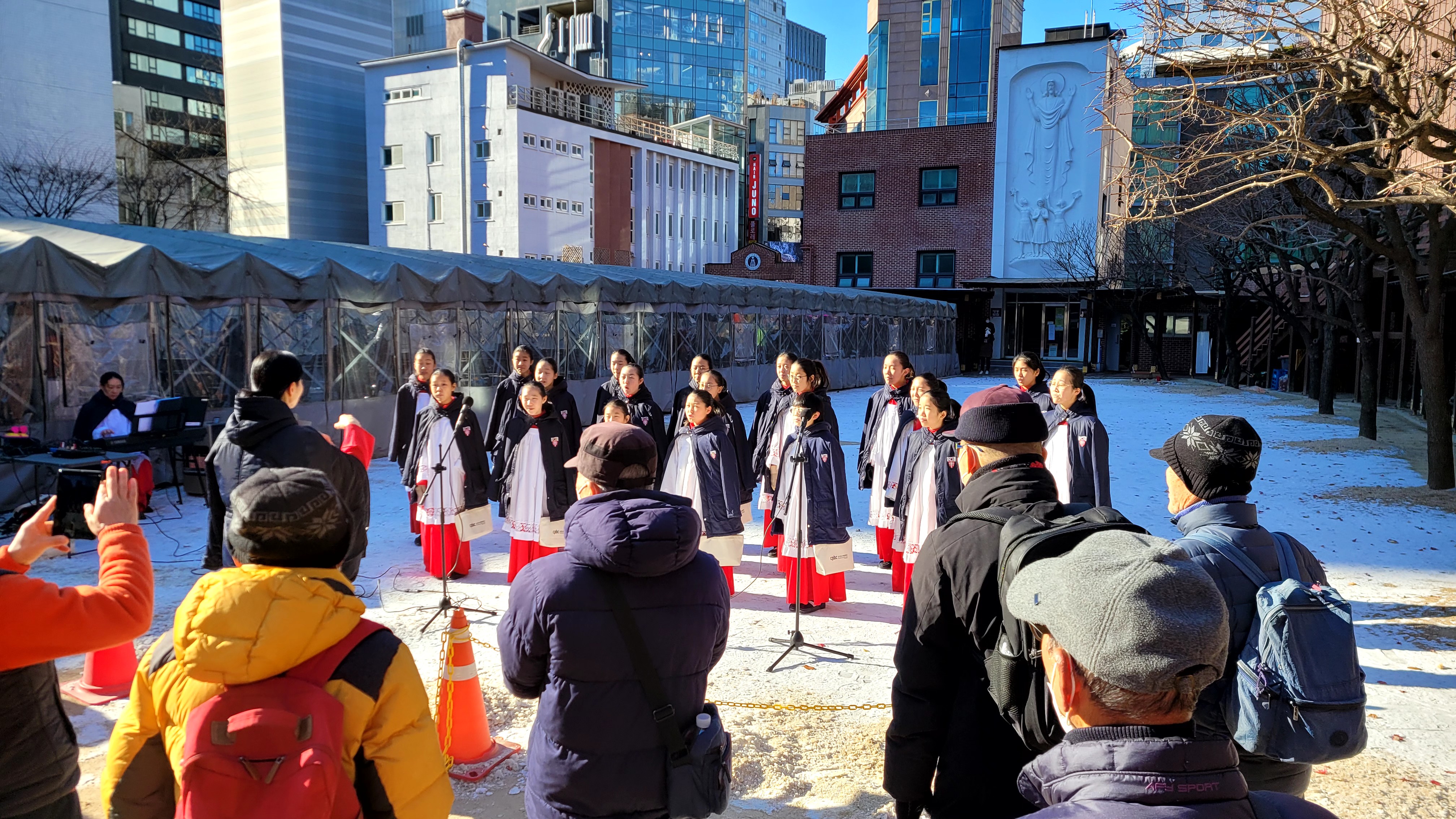 추운 겨울날씨이지만 합창단의 아름다운 노래와 열정으로 음악회를 바라보는 손님들의 입가에는 미소가 번지며 진심으로 좋아하며 치는 열띤 박수소가가 명동밥집 운동장에 가득찼습니다. 추운날씨에 수고해주신 어린이 합창단과 지휘자, 반주자님들께 진심으로 감사드립니다.