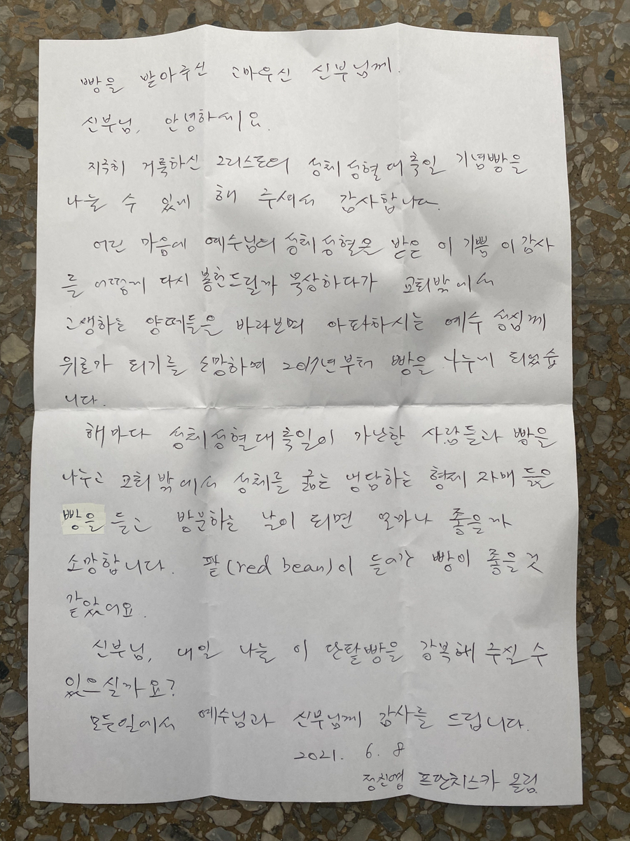 그리고 빵에는 “예수님께서 빵을 들고 찬미를 드리신 다음, 그것을 떼어 제자들에게 주시며 말씀 하셨다. ‘받아라. 이는 내 몸이다.’” 라는 마르코 복음 14장 22절 말씀을 직접 인쇄하여 모두 하나하나 손수 부착해서 보내주셨습니다.
